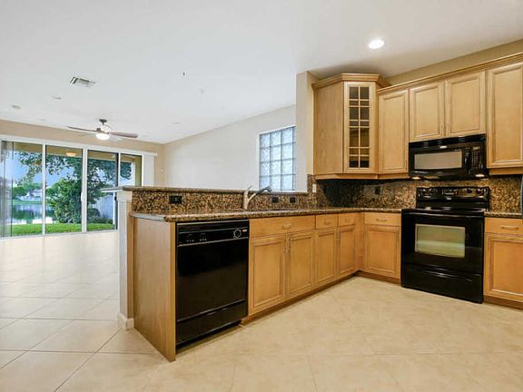 Enjoy sunsets over the lake in this beautiful lakefront home in the very desirable Palm Beach Plantation subdivision.This beautiful home feature wood-look tile in the bedrooms and diagonal tile throughout the remainder of the house , The kitchen is open to family room afeatures granite counter tops & granite back-splash, upgraded maple cabinets with molding,& black appliances. Master suite with bay window overlooking lake, his & her closets, coffered ceiling, master bath with Jacuzzi tub, custom tile shower & dual sink raised vanity. Air conditioning and water heater both replaced in 2014, home is wired for alarm system. HOA covers lawn care, sprinklers, guard gate, state of the art fitness center and clubhouse. Must be seen to be appreciated.