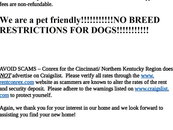 WE DON'T ACCEPT SECTION EIGHT We are a pet friendly NO BREED RESTRICTIONS FOR DOGS At Conrex we give you the flexibility to view our listings at your leisure, with our Self Showing Properties using Rently. AVOID SCAMS Conrex for the Cincinnati/ Northern Kentucky Region does NOT advertise on Craigslist. Please verify all rates through the www.rentconrex.com website as scammers are known to alter the rates of the rent and security deposit. Please adhere to the warnings listed on www.craigslist.com to protect yourself. EVERYONE OVER THE AGE OF 18 MUST APPLY Approval is based on the results of the non-refundable online application. The application fee is $45.00 each, everyone over the age of 18 must apply and must pay the $45 fee. Click the link below to see all the rental criteria Please click the link below for the details about the application process This property allows self guided viewing without an appointment. Contact for details.