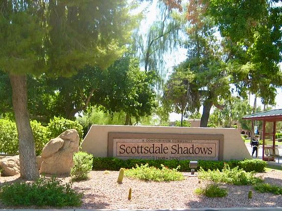 Exceptional Value unites with Exquisite Style in the Scottsdale Shadows. This rare end-unit gem is grounded with high-end, grey, porcelain meticulously tiled throughout entire unit. Immaculate SS Samsung kitchen appliances flank the ample, custom wood cabinetry. Quartz kitchen counters & custom back splash exude a neutral elegance. Spacious master closet is fitted with built-in wardrobe. Private patio is ideal to enjoy sunsets over Camelback Mt. & is fitted w/custom screens & includes storage closet. Amenities abound with 3 heated pools, workout facility, sauna, 2 lit tennis courts, library, art room, business center, private 9-hole golf course & more! HOA covers air conditioning, heat, water & trash Underground, secure & dedicated parking stall, #117 included with sale & is conveniently located close to bldg. entry. Nestled in Old Town Scottsdale, you'll have ample access to restaurants, pubs, shopping and galleries & museums. Ideal for a seasonal escape or a year-round sanctuary, the Scottsdale Shadows Lifestyle is your oasis within reach.