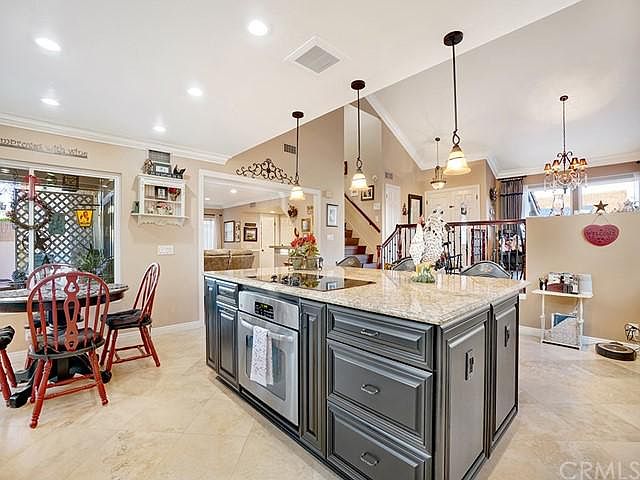 An exquisite tri-level home in La Palma home is a must-see for anyone looking for a magnificent abode! This lovely Woodside home in La Palma, which was remodeled, exudes sophisticated elegance while maintaining a distinct character. The designers spared no cost in creating a stylish living experience for your next move, from the impeccable millwork displayed in the crown molding throughout the home to the etched windows and the family room fireplace. Custom touches extend to the French country kitchen cabinetry, granite countertops, and wine fridge for a classy space to prepare gourmet meals. A superb blend of hardwood flooring, travertine, and luxury carpet flow underfoot throughout the open floorplan while masterful interior paint and recessed lighting update and brighten up every space. In the fenced-in backyard surrounded by lush landscaping, sit back and relax with calm views of a glistening pool. All year round, entertain guests while dining al fresco on your covered patio. A laundry area, custom storage, a two-car garage with direct access, a well-maintained front yard, bespoke railing, tile roofing, custom granite work in the baths, and a jetted bath are among the additional features. There are parks nearby, as well as Cerritos, which has limitless restaurants and shopping, and the 605, 405, and I-5 are all close by for simple commuting. This dream haven in La Palma is just waiting for you to arrive and claim it as your own!