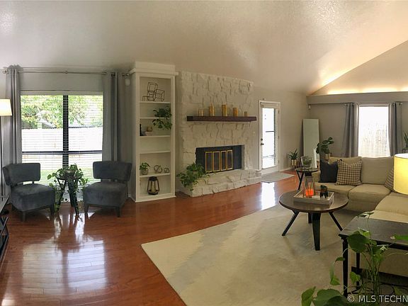 Come enjoy this beautiful well cared for home in a traditional style with a contemporary and updated presentation. Located in a mature neighborhood, experience natural lighting throughout with skylights, large sun lit windows, and vaulted ceilings. New roof in 2019 with newer exterior paint, professional updated landscaping, and a full privacy fenced open back yard for fun with family on the covered patio. Fencing posts in concrete for strong support. Plenty of room for a garden and recreational area. New Lenox HVAC and water heater by AirCo installed in August 2022. Hardwood floors in the living/dining room; tiled floors in the foyer and kitchen. Large kitchen, breakfast nook, and pantry. Fresh paint and lots of storage. Garage area entry to mudroom with utilities, washer and dryer. Spacious bedrooms; master suite with large walk-in closet. Large stone fireplace with gas logs to create a cozy fall and winter evening. This home includes all appliances, termite bait system, hardwired for security. Located to easy access to 169 and turnpike, shopping, recreational activities, restaurants, and schools.