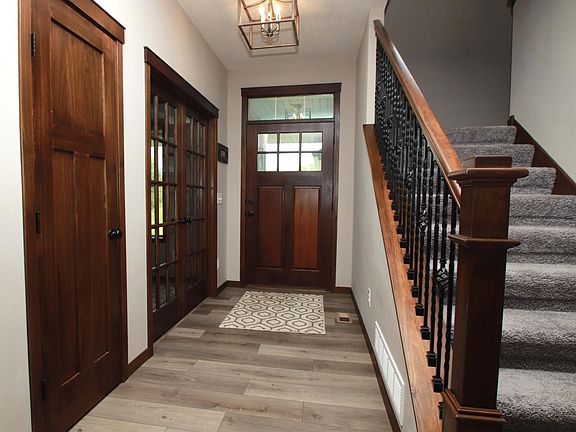 Immaculate 4 bedroom/3 bath/4 car garage home on the Mississippi River in Clear Lake. Large 2.7 acre lot with 225 feet of river frontage. This home was the builder, Drake Homes, model home in 2020 with many upgrades throughout. A welcoming front porch and a 42" wide wooden door greet you as you enter this fabulous home. 9' ceilings on main level, and French doors on the office. Great room has gas fireplace completed with stone, and wood mantle. The kitchen boasts 42" high upper cabinets, granite, center island, ceramic backsplash, stainless steel appliances, built in shelves,, apron stainless steel sink, and walk in pantry. Main floor laundry. Beautiful wrought iron and wooden railings grace the stairwells. Master walk in closet and en suite with double sink vanity, free standing soaking tub, and ceramic tiled shower with glass doors. 4 car garage has extra outlets and 16 x 8 overhead doors. Basement ready for finishing with bath stubbed in. Exterior professionally landscaped.