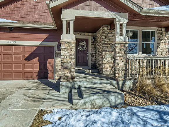 Welcome to a wonderful move-in ready ranch home with a neighborly, covered front porch, situated on a large south facing lot for great snow melt. Terrific oak hardwood flooring on the main level with high ceilings and lots of light through the bright windows. A fantastic open feel of the kitchen, with upgraded cabinets, Corian counters, eat-in area, pantry, island, stainless appliances including a gas range, oak hardwood flooring, family room with bright windows, gas fireplace, entertainment center built-in, and covered patio just outside. A master bedroom suite is sure to please with tray ceiling, fan, attached 5-piece master bath, and walk-in closet. Enjoy entertaining in the finished basement great room with bar, fridge, microwave, and surround sound. Professional landscaping including custom color-stamped patio wired for your hot tub, service sidewalk at garage side entry, sprinkler system, privacy fence, heavy-duty gate, backyard storage sheds included, upgraded exterior LED lighting fixtures, included garage storage shelving, Ring doorbell, and Ring camera security with light. The home has been well cared for including 2-year old furnace, central A/C, upgraded LED energy conserving lighting, newer roof (2018), exterior & interior paint. Newer elementary, new middle school, new high school, and lots of open space very close. Come and see all this terrific home has to offer with a low HOA and property taxes less than half of newer homes property taxes and no metro district. We can close quick. Set a showing today.