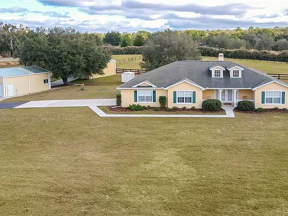 If you've been looking for the perfect horse property - you need not look any further! This fabulous, well maintained property has it all - 4.6+ acres of good pastures, fully fenced & cross fenced, 3 stall shed row barn with feed/tack room (if additional stalls are needed there is room to add on), water & electricity. Great location - close to the Withlacoochee riding trails. Round pen is negotiable. Home is a gorgeous country-style home with 4 bedrooms plus an office, 3 full baths, tile & wood floors throughout the living area. Living room has cathedral ceilings and a massive stone, double-sided fireplace stands between the living & dining rooms. The kitchen boasts beautiful oak cabinets, S/S appliances & a center island. Master bedroom has two walk-in closets with built-in shelving. The Master bath has been updated and has dual sinks, quartz counters and a large zero-threshold walk-in shower. All bedrooms have tray ceilings and carpeted flooring. Enjoy a cup of coffee in the morning or a glass of wine in the evening on your screened lanai overlooking your expansive pastures. For the guys with lots of toys - there is 32'x28' aluminum/steel detached 3-car garage and a 32'x28' workshop (which could also be used as a 3 car garage). Both building have 220 electrical. This property is move-in ready for both you and your horses! Call today to schedule an appointment before it's gone! Note: Grass in the photos has been slightly retouched due to the last winter frost.