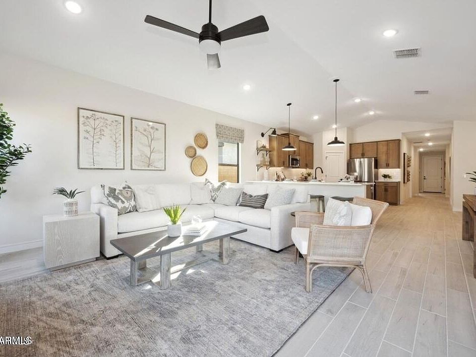 Astonishing model 5-Bedroom Home in Prime Glendale Location! Experience modern living with loft-inspired design elements in this spacious 5-bedroom, 3-bath home, perfectly situated just minutes from premier shopping, dining, West gate sports/ shopping/ entertainment center, and the 101 Hwy. The expansive great room provides the ideal space for both lively gatherings and quiet nights in. The gourmet kitchen features rich dark brown 42'' cabinets, sleek quartz countertops, and stainless steel GE appliances—including the refrigerator—making it as functional as it is beautiful. Enjoy the elegance of 6x36 wood-look tile in main living areas, paired with plush carpeting in the bedrooms for comfort.