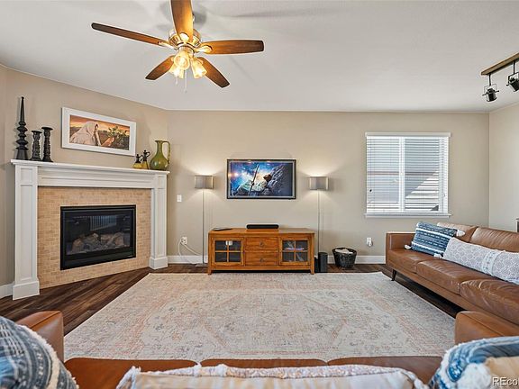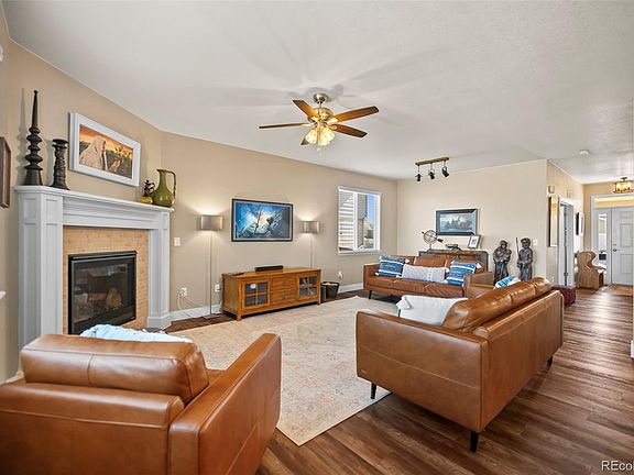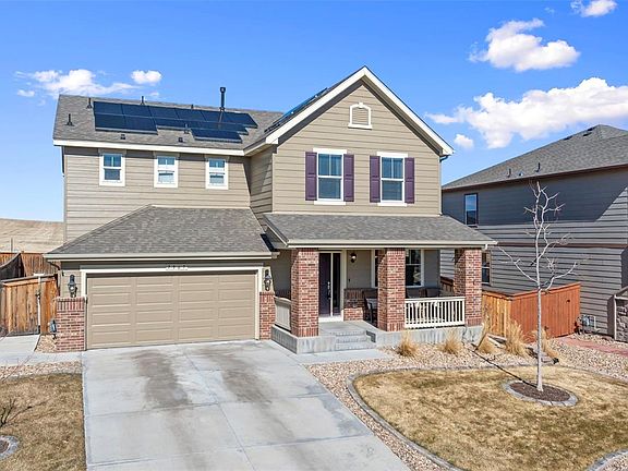 This beautifully designed home offers modern upgrades, generous living spaces, and thoughtful details throughout. The gourmet kitchen is a chef’s dream, featuring leathered granite countertops, a gas stovetop, double ovens, a microwave, and 42-inch upper cabinets. Soft-close drawers, pull-out lower cabinets, and a walk-in pantry with wraparound wood shelving provide ample storage. The living room boasts luxury vinyl plank flooring and a cozy corner fireplace, creating a warm and inviting space. A main-level office with solid double doors and transom windows is perfect for remote work. Additional main-floor highlights include an entryway with a coat closet, a drop station near the garage entry, and a convenient half bath. Step outside to a spacious concrete patio, ideal for outdoor entertaining. Upstairs, the primary suite features 10-foot ceilings, a luxurious 5-piece bath with a rain showerhead, a linen closet, and a private water closet. The walk-in closet offers built-in shelves and rods of varying heights. Three additional bedrooms provide ample space, with walk-in and standard closets, ceiling fans, and included curtain rods. The finished basement offers a large rec room, additional storage, and two more bedrooms. A ¾ bath with an oversized shower, a half bath with wood-look tile, and a radon mitigation system add functionality and peace of mind. Additional highlights include 9.5-foot basement ceilings, a water softener (leased), and solar panels. This home is move-in ready with modern finishes, ample storage, and stunning upgrades.