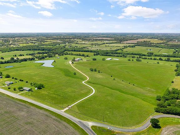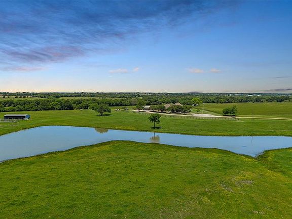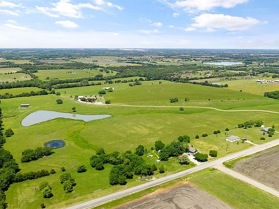This Rolling Ranch Has It All! Amazing 150+ acre property with incredible panoramic views! Enjoy the porch view of your 16' deep fishing lake! The Rolling Ranch offers 7 ponds, 2 steel barns 80x60, 30x60 & 30x40 workshop with 3 roll-up doors & 2 16ft covered awnings. Custom home with extensive gleaming hardwoods in formals, family & kitchen & crown molding in every room. Gourmet kitchen has gorgeous custom cabinetry with pull out drawers, island and over-sized breakfast bar. Large Mstr berm with patio and the mbath has separate marble jet tub and walk-in closet with built-ins. Wait until you see the HUGE pantry & cedar closet with built-ins. Pipe & barb wire fencing. 8 miles to HWY380 & 50 mins to DFW airport.