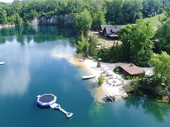 Clearwater Farm is truly a property that cannot be duplicated. Once a working quarry whose marble was so prized, that it was used in the construction of our US Capitol building and the headstones in Arlington Cemetery for veterans of the civil war. Today that same marble with its dazzling white hue, is what allows Clearwater farm its name. The sparkling 10 acre lake features depths up to 90' deep and the dramatic white marble allows the sunlight to penetrate its depths and gives it its gorgeous clarity and color.An outdoor enthusiasts dream, the lake offers spectacular swimming, boating and fishing. There is even a variety of diving cliffs for the more daring. Some resort-level enhancements include a white sandy beach with dock, a large screened Gazebo, picnic area, fire pit and outdoor sound system. Overlooking it all, is the ultimate lakeside retreat,a fabulous log home custom built-in 2007. There is also a 50 x 80 garage tucked out of site for cars and toys or equestrian facilities