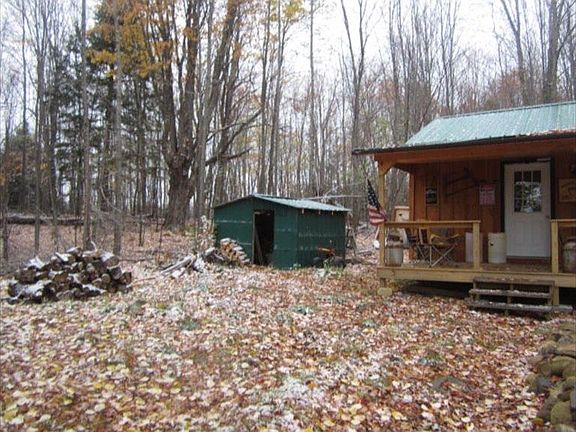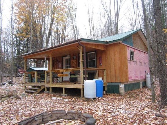Price drastically dropped on this cozy little cabin with loads of privacy! Features nice open living area with a wood stove to keep you toasty warm! Located off the grid but has propane stove & lights and is wired for a generator. Full bath with shower and a nice porch to sit and just relax or build yourself a little camp fire in the fire pit. Property has rights to river across road, surrounded by state land perfect for hunting and hiking!!