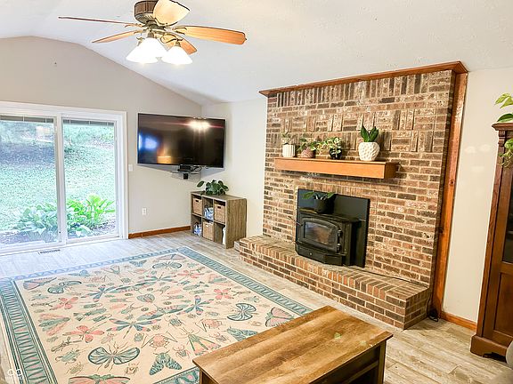Peaceful 3-Bedroom retreat on 5 wooded acres. Welcome to a private oasis! Nestled on 5 partially fenced wooded acres, this comfortable 3-bedroom, 2.5-bath home offers 1,744 sq ft of upstairs finished living space and an unfinished basement with high ceilings. This property combines spacious privacy with updated amenities, providing the perfect escape from city life. Conveniently located 10 minutes from highway 67. Equipped with high speed fiber internet, fast enough for any remote worker. Step inside and enjoy the warmth of custom butcher block countertops and a large kitchen island with seating. The barn wood-look ceramic tile flooring in the kitchen, bathrooms, and main living areas adds a cozy, rustic feel. And, the dining room has electric heated flooring. Recent updates include a new roof installed in 2022 with a transferable lifetime warranty and new Pella sliding doors in both the living room and master bedroom, offering seamless indoor-outdoor living. The spacious high ceiling unfinished basement with a half bath is ready for your personal touch that could add more living space. The attached 2-car garage provides ample storage. A detached carport offers more storage. Stay warm with multiple heating options, including a brick fireplace with wood-burning insert, corn-burning furnace, and propane hookups. Step outside onto the large custom deck, complete with a hot tub. It's perfect for watching wildlife and unwinding after a long day. Timber potential with mix of mature hardwoods. It's just under 2 miles to Burkhardt creek nature park for cycling and hiking. The landscaped yard is adorned with mature perennial plants, creating a low-maintenance. garden you'll enjoy year after year. Wildlife abounds with a huge variety of songbirds, deer, and turkey. With 5 acres of wooded privacy, bring your horses or livestock to the fenced acreage with insulated 5-strand high tensile. This property offers utility with peace and quiet. Motivated seller!