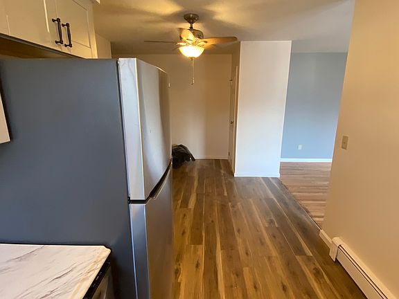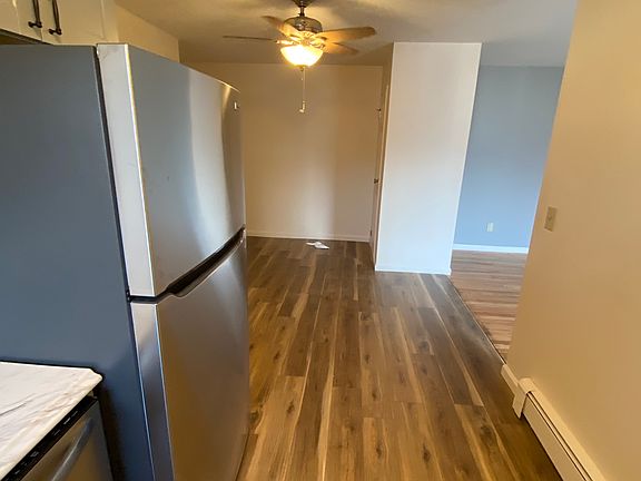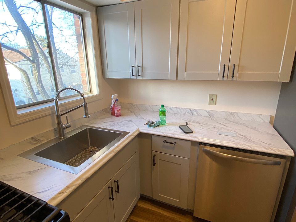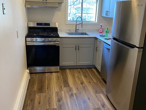 Unit is currently being renovated with Brand new kitchen cabinets and counters. All new stainless-steel appliances, stove, fridge and dishwasher. All new flooring throughout. laminate in kitchen, hardwood in living room, carpet in bedroom. All new solid wood raised panel doors and baseboard molding. Bathroom has new flooring, vanity mirror and lighting and new toilet as well. 1 year lease or longer. Rent includes heat and hot water, water, sewer, cooking gas. Tenant pays electric and cable. Includes small storage unit, Off street parking and laundry in building.