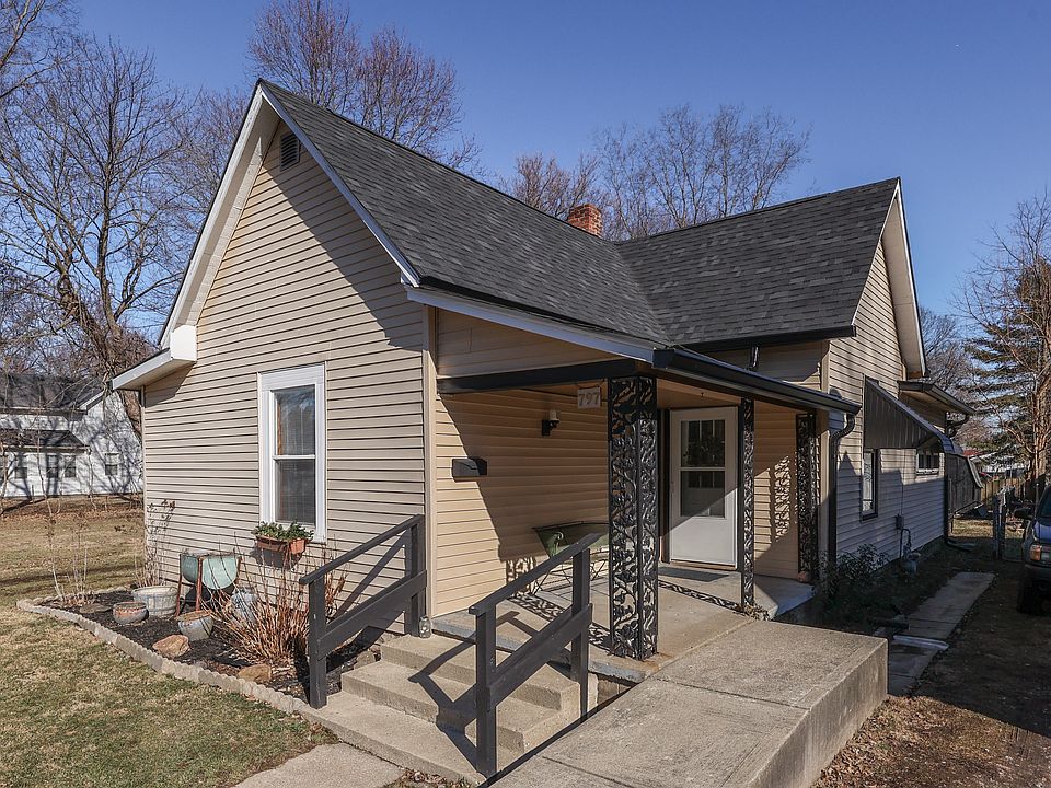 Franklin, Indiana: REMODELED Early 20th Century Craftsman Bungalow circa. 1910- Over 1000 sqft on Quiet Street with Large Covered Front Porch & Covered Wood Deck. 2 Bed 1 Bath features BRAND NEW ROOF & GUTTERS + NEW Luxury Vinyl Plank FLOOR throughout. Fresh Exterior Paint. NEW INTERIOR PAINT. MASTER: Soaring 10' Ceiling, Large Dual Entrance Walk-In Closet; Transom Windows of the Era Ovewr the DOors; KITCHEN: Updated and Upgraded - Gorgeous NEW Upgrade Countertops, Amazing NEW Sink & Fridge & Range/Oven; Large DINING ROOM: LVP Floor; 15 x 15 GREAT Rm; UPDATE Bathroom with Vintage Tub; Private LAUNDRY Rm: washer/dryer negotiable; Plenty of Parking, Driveway, Backyard with Mini Barn & Fire Pit; Close to all things Franklin - Little League, Artcraft Theatre, The Willard, Johnson County Museum of History; US 31, I 65; Franklin College; Franklin Parks; Schools; Grocery; Restaurants, Johnson County Memorial; New Bathroom Sink & Cabinet, New interior lights New Exterior Vents - LARGE ATTIC Area that could perhaps be adapted to become 2nd Story/Loft. Newer Furnace & Newer Gas Water Heater. Pride in Ownership - You'll be happy you looked. Many Upgrades as well as many Vintage Touches