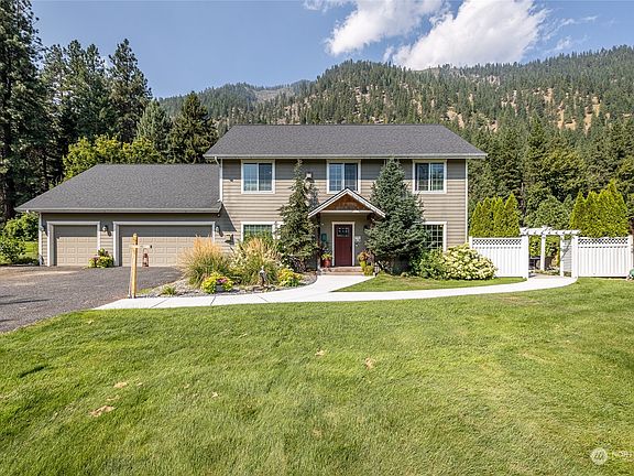 Thoughtful details are found throughout this 1.2 acre property designed to host and entertain. Located at the base of Icicle Canyon, just minutes to downtown Leavenworth, surrounded by stunning landscaping and gardens - you can't help but relax. The 4 ensuites are spacious (1 located on main, 3 up) with fireplaces and jetted tubs. Two kitchens, w/ walk in pantry, offer many possibilities - feed a crowd or run a small side business. Living and dining are connected (with stone fireplace as the focal point) with large windows and a slider out to the serene patio. The covered BBQ shelter (with storage behind) and potting shed are fun backyard features! Home is set back off the road with ample parking, 3 car garage, and irrigation water.