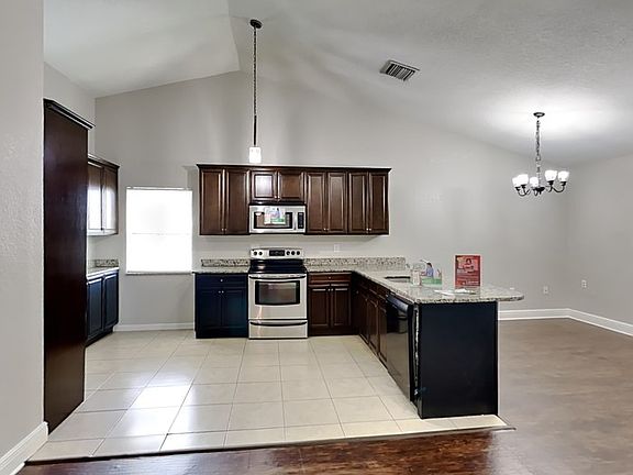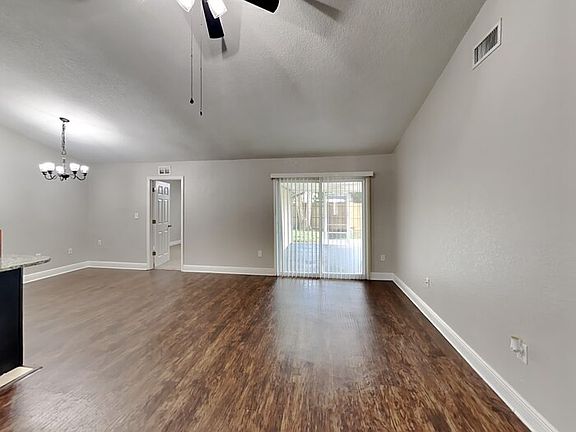 Wonderful 4 bedroom 2 bathroom home with beautiful features! Walking into the property you have an open, spacious room housing the living, dining and kitchen area with make up the heart of the home. Kitchen is beautiful with tiled flooring, granite counter top, breakfast bar, dark wooden cabinetry and all major appliances including refrigerator, stove, dishwasher and microwave. Master bedroom comes with a walk in closet and full bathroom with tiled flooring, vanity sink and a standing shower. Three additional bedrooms including a large fourth bedroom located through the dining room. Screen lanai, two car garage, utility hook ups and a fenced in back yard. This property allows self guided viewing without an appointment. Contact for details.