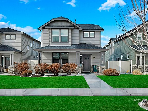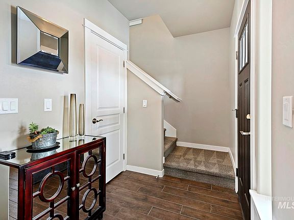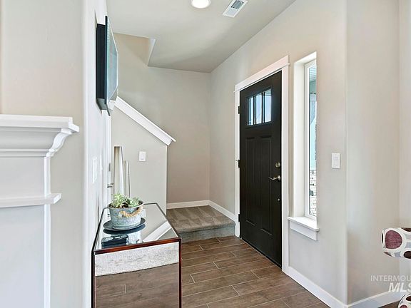 Sophisticated home is in "like new" condition and is a stone's-throw away from Micron. This chic oasis abounds with quality features including wood grained tile flooring throughout the ground level, gas fireplace with built-ins, bathroom tile flooring and upgraded carpeting, newer custom blinds & ceiling fans, Quartz counters in the kitchen and bathrooms, SS appliances and pantry. The main suite has dual vanities, a walk-in closet and extra closet. Ground floor office has a closet and can be a 4th bedroom. Large covered front porch and a very low maintenance xeroscaped back yard with partially covered deck, hard wired fountain and custom gas firepit for peaceful moments. Located in a quiet development that includes a pool for summertime relief. Includes refrigerator, washer, dryer, and Ring doorbell. This home is ready for you to move in and enjoy!