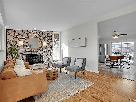 As you step inside, you are greeted to the living room featuring high ceilings, a natural stone wall, wood-burning stove, and brightly restored floors. This room is perfect for cozying up with a good book or entertaining friends. The bright light that fills the space creates a warm and inviting atmosphere. The layout is open to a large dining area. This kitchen is a dream with new stainless-steel appliances, tasteful quartz countertops, and aesthetic backsplash. Whether you're preparing a quick meal or cooking up a feast, this kitchen will have everything you need. Each of the 3 bedrooms provide their own peaceful retreat--complete with refinished hardwood, new lighting and fans, and lofted ceilings. The recently installed vinyl-framed windows provide efficiency for the heating and cooling months, as well as an abundance of natural light throughout the home. Outside, you'll find a lovely private patio where you can relax and take in the beautiful Colorado weather with friends or find your zen in gardening among the large bonsai trees. The backyard offers plenty of space for outdoor activities-- equipped with 10 raised garden beds ready for spring planting and a designated area for a dog run. Additionally, there is a storage shed for lawn tools and double storage closet under the covered carport for your convenience.