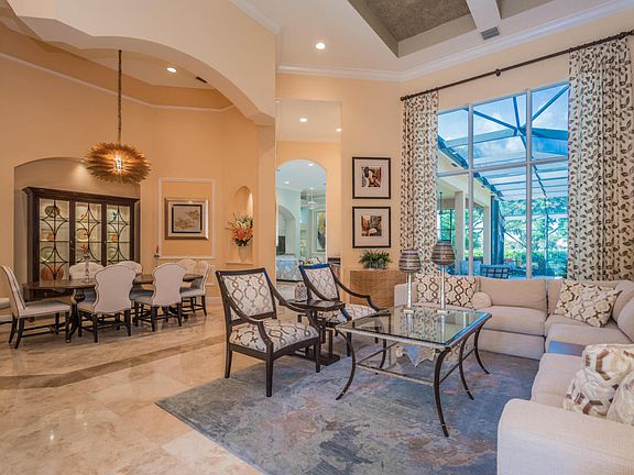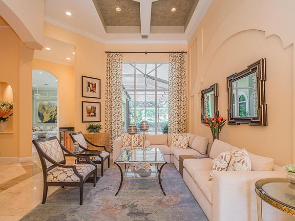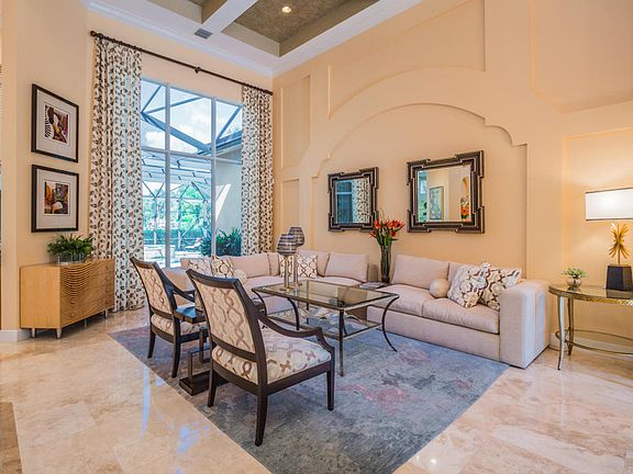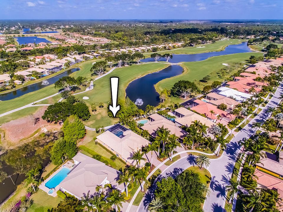 Magnificent golf, wooded, and water views surround this exceptional & luxurious, bright & spacious, 4BR/41/2BA + den open-plan estate home situated on a mini cul-de-sac on the 11th green of the newly renovated Legend Course of the prestigious private community of The Club at Ibis. Top-of-the-line upgrades include crown molding & solid wood doors throughout, coffered & tray ceilings, marble & wood flooring, large impact glass windows & doors, custom built-in cabinets with quartz countertops, California closets, and Kitchen Aide appliances. The patio was recently covered with an architectural overlay concrete design and boasts a custom freeform, screened-in swimming pool with a heater & Aqualink controls. The vibrant colors give it a warm, welcoming feeling. It offers the best of everything!