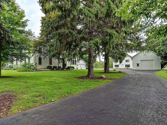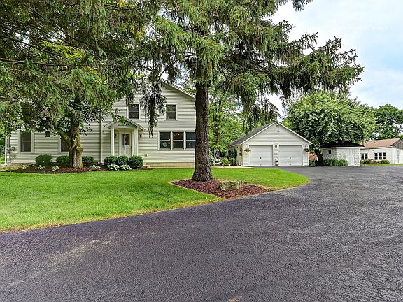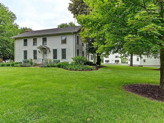 Remarkable opportunity to own a unique property on 3+ acres including home, 2 car garage & 2 barns. This home has been meticulously maintained & improved over the years. Large eat in kitchen features custom shaker cabinets, island with breakfast bar, SS appliances, enough counter space for all the cooks, table space, hardwood floors & access to fenced patio area perfect for dog run & safe play area. An enormous walk in utility/pantry closet and first floor full bathroom. Den/Living room hosts built ins & FP w/temperature control for summer ambiance, desk space can be easily converted to beverage area. A spacious family room is open to the living area making it a wonderful space for large gatherings. Hardwood floors flow through the main floor. The heated/cooled sun room provides a sun filled cozy space. Extra wide second floor hallway leads to a 2021 rehabbed master suite with his and hers closets and stunning private bath. 3 additional bedrooms and large closets. There are 2 laundry options, one is located in the shared 2nd floor full bath, and the other in the basement. The unfinished basement provides great storage or future living space. The front barn/workshop is 36x24 with loft storage and a 12x10 overhead door, heat, 100 amp electric, cold water & rough in. Temporary set up for motor home with sewer dump & water/electric hook ups. The back barn host 2 offices one with heat and AC the other just heat, 1/2 bath with separate septic, 2 storage lofts & 2 11x10 overhead doors. A 2 car detached garage sits close to home. Chicken coop & milk house now used for storage. Part of the home was built in the 1900's and has been fully renovated, part of the home is a 1998 addition. The master and master bath were renovated in January 2021. New roof on house, barns & milk house in 2018. Bring your chickens and horses with you.