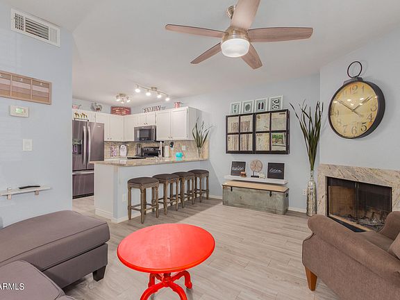 What a gem! This ground unit condo is in the perfect Peoria location and has SO many upgrades! You'll feel the open and inviting atmosphere as soon as you step through the door! The soothing color palette sets the tone -along with the real fireplace- you'll feel right at home. Everything has been updated - tile flooring throughout, stunning granite counters with granite backsplash, modern light fixtures, chrome hardware, lovely white cabinetry and matching kitchen appliances tie it all together. Master bedroom has double closets with tons of storage. Bedroom has slider with access to a private covered patio and private courtyard complete with artificial grass! Bathroom has updated vanity with granite counters, decorative mirror and custom light fixture. Now for the bonus features: Designated parking spot is right in front of unit, pool is directly across the street, home has extra storage on back patio, and to top it all off: in-unit laundry! With proximity to shopping, recreation, freeway access, and all major conveniences - this unit will not last long!