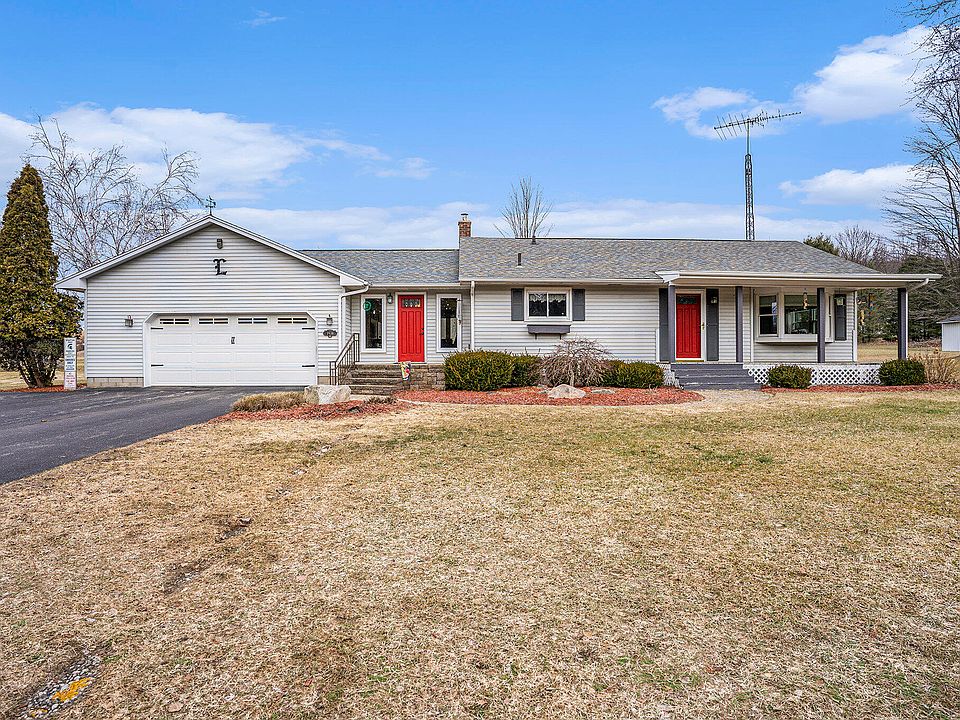 Well cared for ranch home, 4.6 acres just minutes from LK Michigan and Silver Lake. This adorable home has many extra accents. Beginning from the stone porch you enter through the red door into a nice family/dining area featuring ceramic tile and wood floors along with nice windows that bring the back yard in. Custom cabinets in the kitchen including a desk area. The beautiful wood floors continue to the livingroom which offers a bay window out to the covered front porch. One of the 3 main level bedrooms has been converted to allow main level laundry and craft area. The full basement is partially finished with some drywall, ceiling and trim. This could easily be updated to offer more living space. There is a 24 x 22 workshop behind the attached garage & also 24 x 24 pole barn in the back.