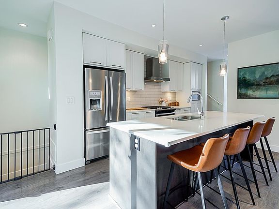 "The Links" Built by Infinity Properties. This majestic Tudor style end unit townhome features wide plank laminate floors connecting generous living spaces. Breathtaking, open concept entertainers gourmet kitchen features stainless steel Whirlpool appliances w/ gas range, built-in pantry, modern cabinets with undermount lights, quartz counters & a large island perfect for casual meals. The private fenced yard and patio backs onto a greenbelt. Laundry is conveniently found alongside sunlit bedrooms with tranquil master boasting vaulted ceilings, walk in-closet w/ deluxe spa-like bath and heated tiles. Double garage and driveway parking, as well as guest parking nearby. Located minutes to parks, schools, transit & every desirable convenience. Here is the lifestyle you have been dreaming of.