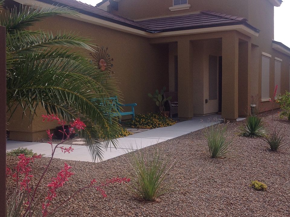 This beautifully upgraded 1,471/SF Aster Model Floor Plan with Bay Window Dining and Center Kitchen Island is located in the Frontier Pass Village. Built in 2013 still in "like new" condition. Upgrades Galore! Tile laid on the diagonal, new carpet in bedrooms, 5" baseboards, crown molding, window coverings and ceiling fans in every room. The master bedroom has a wall a windows, an en suite bathroom and walk in closet. The second bedroom is on the opposite end of home from the master bedroom providing plenty of privacy for your guests. A separate Laundry Room is just off guest hallway. The laundry room has built in cabinets. The washer, dryer and refrigerator are included. The garage has extra overhead storage and built in cabinets, sealed floor and water softener. Front and backyards are professionally landscaped with drip system on timer. 4' wrought iron fenced backyard, extended paver patio, alumawood patio cover, privacy panels on each end of patio for added privacy. Solar screens installed on most windows. This one is ready to move in to and start enjoying the Sun City lifestyle immediately! Upgrade list available by request. One Year Home Warranty Included.