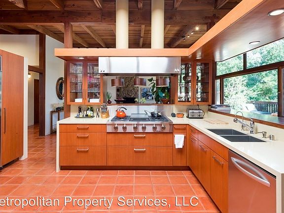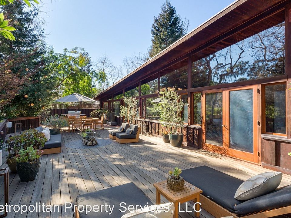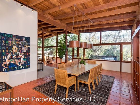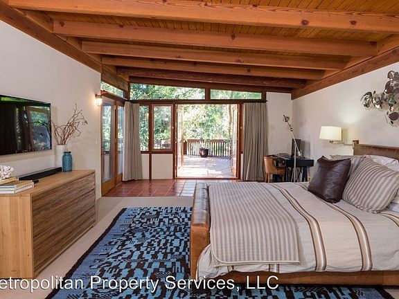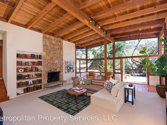 RUSTIC CANYON LIVING - Large 5 bedroom, 4.5 bath open floor plan, post-and-beam home in the spectacular, tree-filled Rustic Canyon section of Pacific Palisades. Opens onto spacious, secluded canyon view deck, surrounded by oaks, redwoods, and sycamores. Private fenced in yard. New modern gourmet kitchen. Wood fireplace, cedar sauna, and multi-car garage. Master includes private office, large bath with spa tub, and walk-in closet. Includes two room suite with kitchenette and private entrance; great for relative or housekeeper. No. 1 rated Canyon Elementary School. Walk to Rustic Park with tennis courts, clubhouse, and pool. Short drive to Palisades shopping and State Beach. 12 miles to LAX. Great home for families.