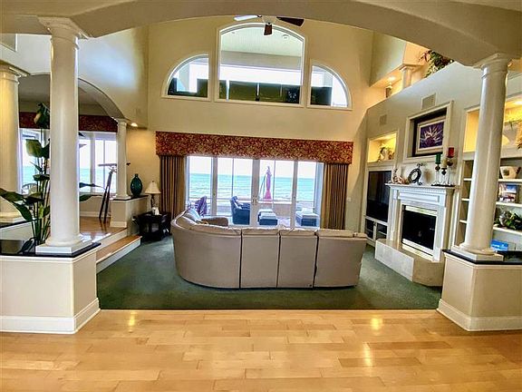 Beachfront Mansion with extensive builder upgrades - 1st time on market - Double lot on Sandy Beach - Water views from every room - 1440sf covered decks with 500sf screened lanai - Open design with extra high ceilings - Entertainers dream home with multiple gathering spaces. 3 car garage with additional 2 car side concrete driveway. Dual zone Trane HVAC system - Heated crawlspace - Automated lighting - Built In Speakers. Main house is 3860sf including a 105' additional to the master closet with an almost finished 783sf bonus room. 2000sf of lakefront patio directly on the beach. Luxury master suite with 200sf dream closet and spa bath with bubbler tub.