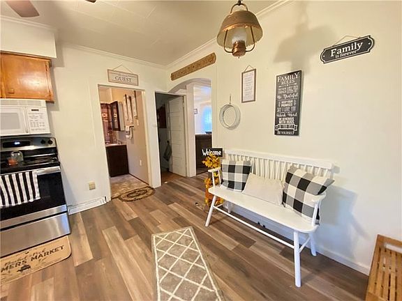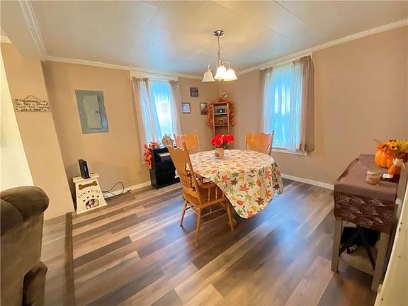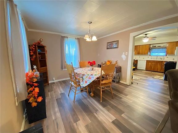 Charming 3 Bd 2 ba home located in 3/4 of an acre with enormous garage space! Updated flooring throughout the first floor. First floor laundry and full bath. Large yard for your animals! Heated with a wood/coal furnace with fuel oil backup. Roof will need some attention. A few tweaks and this home will ready to go!