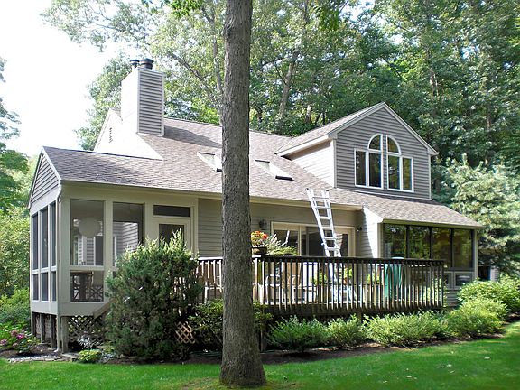 Very welcoming contemporary cape in excellent condition on private .92 lot. Open floor plan & amazing light. 1st floor family room is 3rd bedroom. Fireplace. Newer roof, furnace, cair. Screened porch, deck & patio overlook beautiful, lush yard.
