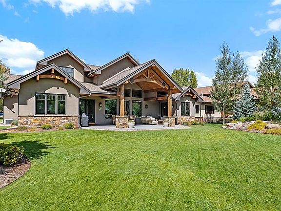 This stunning 4,473 sq. ft. home on the 15th hole at Dalton Ranch is a special opportunity, as homes of this caliber do not come along often. You will find attention to detail everywhere you look in this 5 bedroom, 4-1/2 bath home with attached 3 car garage on half an acre. Construction of the home was completed in 2020 and is in immaculate, like-new condition. MAIN LEVEL: The welcoming entrance to the home opens to a luxurious great room with soaring tall ceilings showcasing dramatic wood beams, floor to ceiling windows facing the mountain and golf course views, and metal bridge and railings connecting both sides of the upstairs and the staircase, adding to the rustic yet contemporary feel of the home. The light and open living, dining and kitchen areas flow together seamlessly in one cohesive living space, focusing on use of natural materials indoors and out. The Mendota gas fireplace and stone surround are accented by built-in cabinetry and lighted art display niches, and the flooring is engineered hardwood and tile throughout the great room. The kitchen is an exceptional example of a modern kitchen, with leathered soapstone and granite countertops on two islands and kitchen bar, rustic knotty alder cabinetry, oversized stainless steel farm sink, and commercial grade Kitchen Aid appliances including 6-burner cooktop, double ovens and warming drawer. The dining room is elegant and can be either bright or moody depending on the time of day. There are gorgeous modern light fixtures throughout the home including the dining room. Close to the kitchen you will find a spacious pantry that is a chef's delight, and a wine bar with black walnut countertop is a fun addition to the space. Down the hall from the kitchen is a half bath, huge laundry room with second refrigerator and plenty of counterspace, coat closet and desk, leading to the back stairs or to the incredible garage. It is entirely possible that your dream garage is found in this home. Garage features include 3 car capacity, professional epoxy coated garage floors, insulated garage doors with coated rails, floor drains, and large attic space with retractable ladder. Large utility/mechanical room is right off the garage for easy access and includes a laundry sink and crawl space access. Back inside on the main level, on the east side of the home is a bedroom that is being used as an office, and a separate spacious primary bedroom suite, with huge walk-in closet, spa-like 5 piece bath, cozy bedroom with cove ceiling, and sunny sitting room close to the back patio and waterfall, perfect for reading or a restful nap. UPSTAIRS: There are 2 staircases for easy access to the spacious second level which spans both sides of the home via the bridge in the great room. You will find three bedrooms (two with en-suite bathrooms), a hall bathroom, and a comfortable flex space bonus room over the garage, with plenty of space to watch movies, work on projects, play games or work on your fitness. EXTERIOR: The home is professionally landscaped with beautiful gardens and a waterfall feature off the concrete back patio, which is covered yet bright, and is an exceptional outdoor living space year-round. The exterior of the home has a pleasing palette of stucco, stone and wood siding and accents.