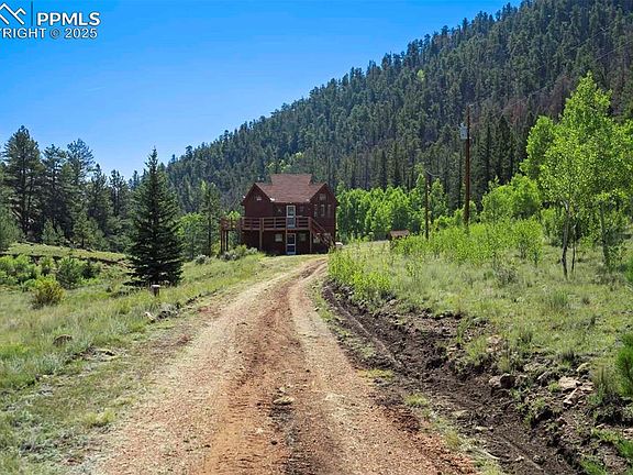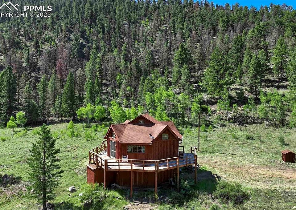At the end of a quiet cul-de-sac in Pike Trails Ranches, this 20-acre retreat offers true seclusion with meadow-to-ridgeline vistas, as timbered hillsides frame the valley floor and rise to wooded slopes beyond. The rustic 1,444-sq-ft two-story with loft rests above a draw and soaks up sunrise and stars from a wraparound deck with treetop views for morning coffee and stargazing. Built in 1981 and sold furnished, it is comfortable for weekends or longer as you plan improvements. Inside, a vaulted great room with exposed beams, warm woodwork, and wide windows draws the landscape in, and a simple country kitchen with handmade cabinetry sits alongside for casual gathering. The main level is joined by a sunlit loft that currently lives as a slumber nook and reading perch. The walkout lower level offers a full bath and windowed laundry area, plus flexible bunk-style space with exterior entry, storage, and a classic wood stove for cool spring and fall evenings. Step outside to granite outcrops and evergreen ridges across your private valley, with wildlife moving through in the quiet hours. A small shed keeps tools organized, and there is room to stage trailers, an RV, or future outbuildings. Big-ticket essentials are handled: grid power, a robust well, and a propane tank in place for immediate use. Sold AS IS and priced to invite updates like electrical finishing, a new septic, fresh flooring, and finish work that will reward the next owner. A reasonable annual HOA provides road maintenance for essential year-round access, and with no covenants, ownership stays simple! Quick access to paved CO-9 opens adventure in every direction. Guffey, Cañon City, Cripple Creek, and Woodland Park are within convenient reach, and nearby public lands, rivers, and lakes offer hiking, fishing, hunting, rafting, and winter recreation. Bring your vision, tools, and skills to claim a rare mix of privacy, scenery, and long-term value in a location that is hard to match and easy to love!