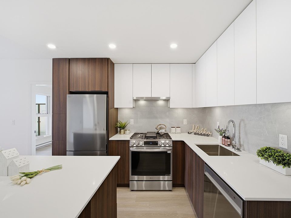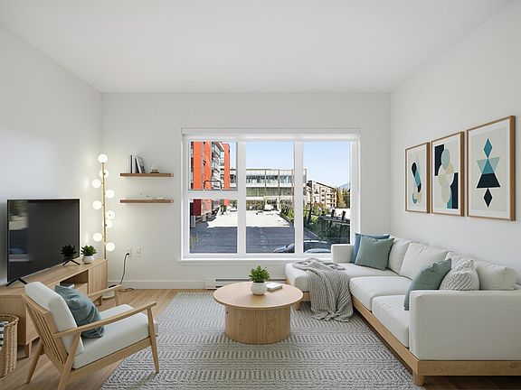 Discover modern sophistication at The District with this brand-new three-bedroom, two-bathroom residence. Designed for contemporary living, it features premium vinyl flooring throughout, a gourmet kitchen with a gas cooktop and full-size stainless steel appliances, and a bright open layout that extends to two spacious balconies-perfect for relaxing or entertaining. Elegant finishes throughout create a refined sense of comfort. This home includes two parking stalls (one EV-ready) and a locker for added convenience. Ideally located in the heart of Willoughby, just steps from shops, cafes, dining, transit, Shoppers Drug Mart, and Independent Grocer-where style meets everyday ease. Brand new and GST included.