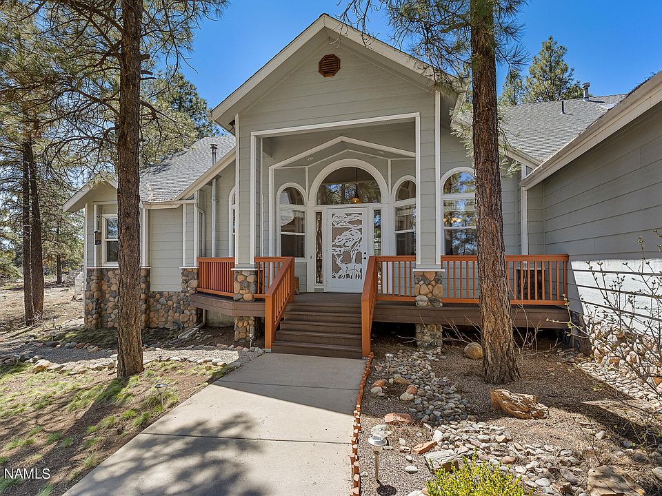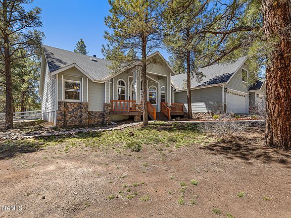 This gorgeous home with stunning views is surrounded by beautiful, mature ponderosa pines. The large great room features cathedral ceilings, wood floors, a gorgeous stone fireplace and ample windows that boast amazing views of the surrounding forest. This fabulous home offers a chef's kitchen, a true dream with alder cabinets, granite tile countertops, and stainless steel appliances. A large master suite complete with picturesque forest views, vaulted ceilings, an en-suite with dual sinks, jetted garden tub, and walk-in shower. A second master en suite upstairs and three additional bedrooms and bath on the main floor complete this abundant home. Get lost in nature in the magical backyard with a lovely deck and large patio, perfect for enjoying nature or hosting get-togethers! A phenomenal custom wooden treehouse play area with rock climbing wall, bridge and zip line is perhaps the coolest in Flagstaff! With acreage and trees, the outdoor options are endless!