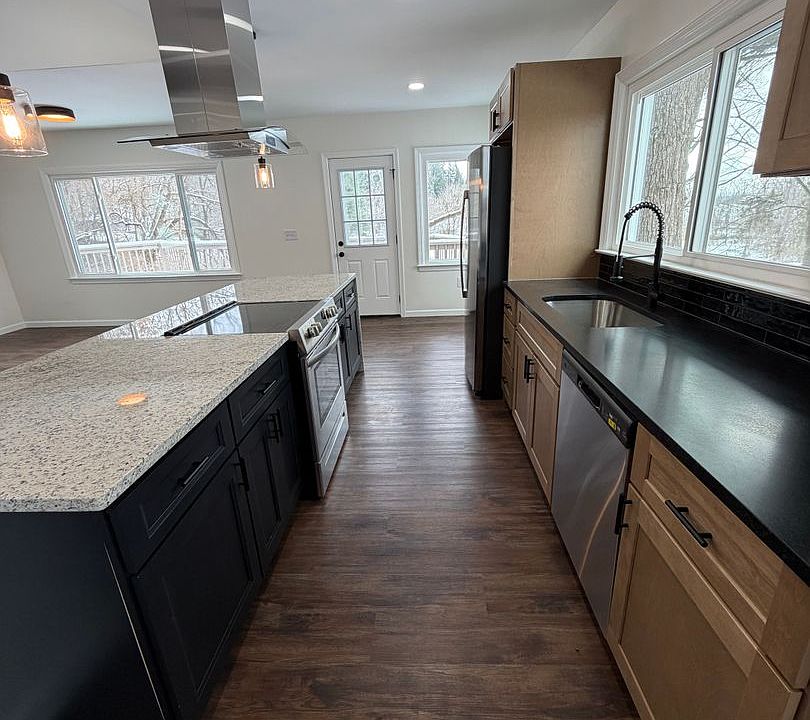 - Black lower cabinets, natural wood uppers, and tile backsplash