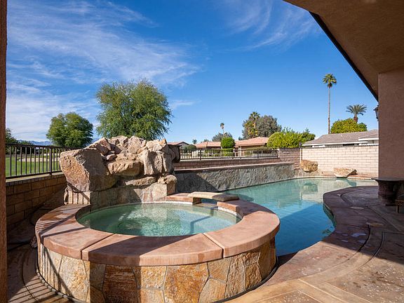 Nestled along the 11th fairway of the Indian Springs Golf Course, this rare golf-course residence offers over 3,000 square feet of thoughtfully designed living space with no HOA dues and sweeping south- and west-facing fairway views.The resort-style backyard is truly one of a kind, featuring two full-sized swimming pools, two spas, a private 9-hole putting green, and a covered patio ideal for year-round indoor-outdoor living. Mature, low-maintenance landscaping is complemented by over seven citrus trees, creating a lush yet effortless outdoor environment perfect for entertaining or unwinding under the desert sky.Inside, the home offers two separate living rooms, providing flexibility for hosting and everyday living. The gourmet kitchen flows seamlessly into a spacious dining nook, creating an inviting setting for casual meals and gatherings. The expansive primary suite is privately situated, while guest bedrooms are thoughtfully positioned on the opposite side of the home, offering comfort and separation for visitors. A versatile bonus space off the primary is ideal for a home office, fitness studio, creative space, or private retreat. Must see to appreciate!