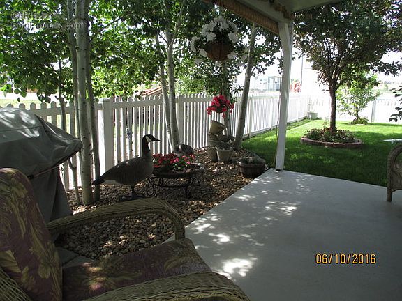 Beautiful home in Prairie Greens! Gorgeous landscaping on this corner lot with large front porch and private covered patio. Huge kitchen has granite tile counters, all appliances, eat-in area, bar, under cabinet lighting, separate pantry. Large master bedroom with walk-in closet. 5 pc master bath has deep corner soak tub, granite tile counter and surround. Open, light feel with vaulted ceilings throughout.