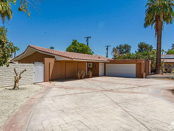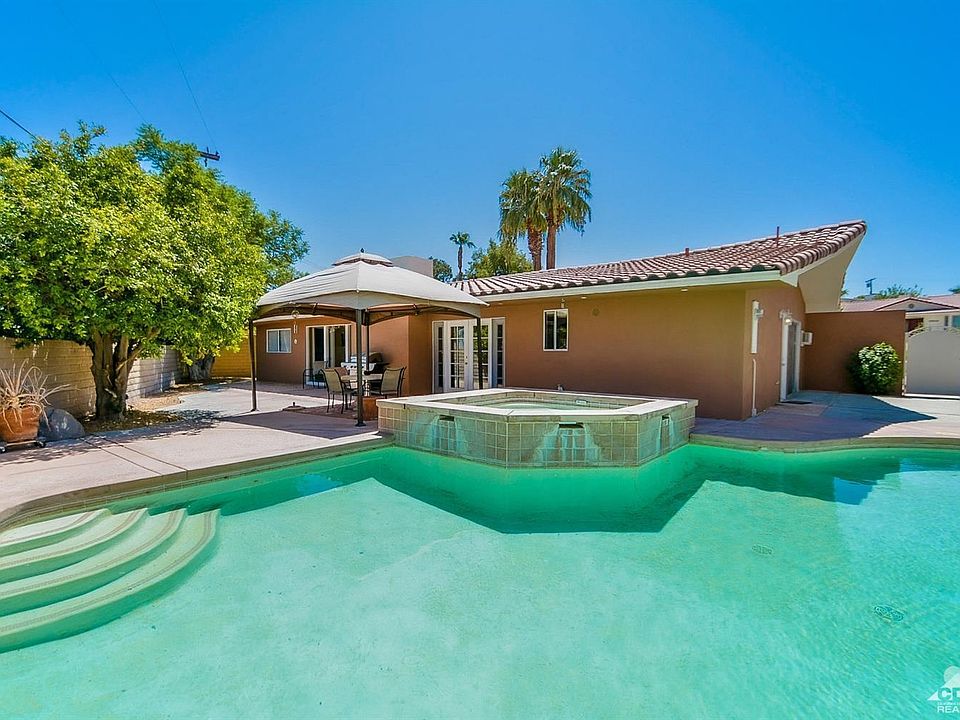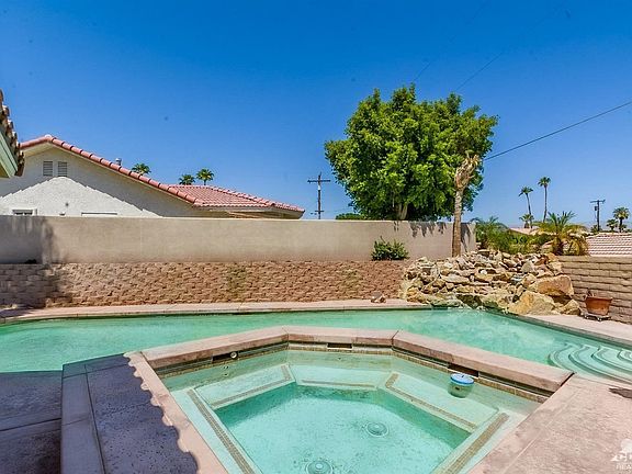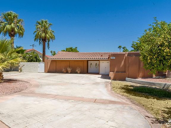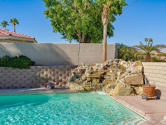 Discover mid-century elegance at Bermuda Dunes Country Club at this very special 10,019 sf (EST) property. You'll be swept off your feet from the moment you pull into the expansive circular driveway, large enough to accommodate your boat or RV. Through the double door entry there is beautiful tile flooring everywhere except the bedrooms. The kitchen and dining area is open to the great room which has a wall of glass that floods the interior with natural light, and a cozy wood burning fireplace thats ideal for those cool winter evenings. French doors lead to your gorgeous outdoor desert oasis complete with a gas-heated pool, raised spa and a spectacular stone waterfall; so perfect for outdoor dining and entertaining. Both the master bedroom & bathroom have outside door access to the patio and pool. Wet swimmers can use this handy bath! You'll stay cool in summer with Central as well as personal bedroom window A/C units & well placed ceiling fans. Make this your own private Shangri-La!