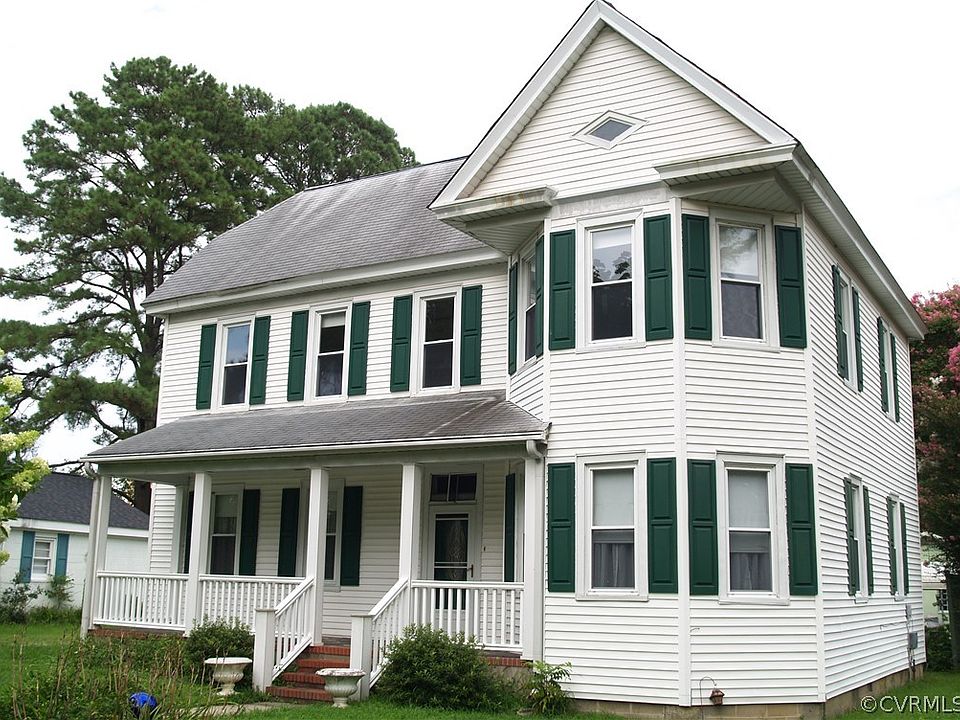 Well maintained classic bayfront 2 story farmhouse style home on Richmond Rd. (US 60) at Toano, about 9 miles northwest of Williamsburg. Approx. 124 years old with many replacements and upgrades including vinyl siding, double pane windows, LVP flooring (refinished pine wood floors in formal dining room), OHWRadiant heat plus package electric HVAC unit, and automatic generator. Galley style kitchen, 18' X 10' rear screened porch, front entrance porch w/slate floor, 160 s.f. mechanical cellar w/ interior access, modernized 1st level bath w/ ceramic shower, 2nd level ensuite bath, claws foot tub in large hall bath in 2nd level; walk-in storage room/closet; early American farmhouse style doors and 9' ceilings in most rooms. 1 car detached garage, masonry block workshop building, metal carport shed, and tool shed are complimentary buildings. Private rear lawn and garden space behind the buildings.