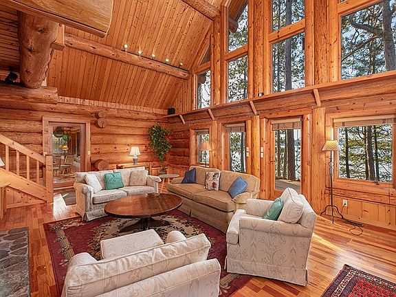 Impressive full log home on 607 acre Big Stone Lake, part of the 28 lake Three Lakes/Eagle River chain. Nestled on 1.85 acres with 139' of sand swimming frontage and Southern exposure. This stunning 4 bedroom 5 bath home offers panoramic waterfront views and features vaulted ceilings, massive stone fireplace, updated kitchen, high end appliances, formal dining room, sunroom, first floor master suite and main floor laundry. All bedrooms are spacious, with many built ins. High speed fiber internet. New (2023) three plus car garage for all your Up North toys and includes electric car plug/charging feature. Numerous seller upgrades. (see list provided) Location is convenient to golf, snowmobile trails, marinas, restaurants and the National Forest. Make your appointment for a personal showing today.