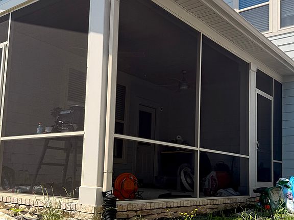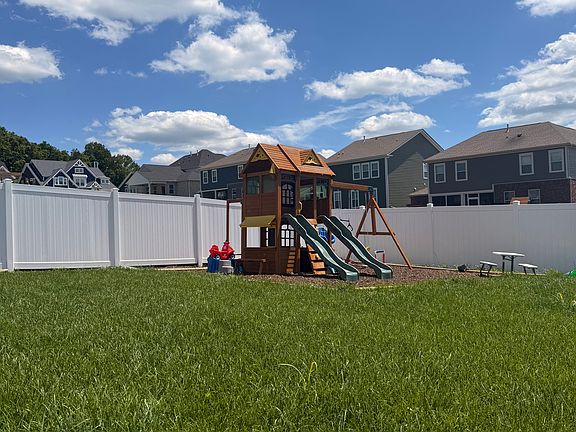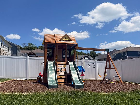 Step outside to a screened-in back porch with ceiling fans, leading to a fully fenced white vinyl backyard that's beautifully landscaped and designed for fun and relaxation. The yard includes a gravel firepit area, a children's playground and swing set, all within a rubber mulch enclosure for safe, low-maintenance play.