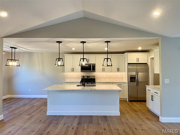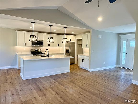 Introducing the Sycamore! This amazing 3 bed, 2 bath new construction home offers incredible value and thoughtful design rarely found at this price point. A welcoming foyer opens to a bright, vaulted family room and stunning kitchen with white shaker cabinets, large quartz island, and full appliance package. Highlights include custom window trim, an abundance of LED lighting, motion sensor lights, LVP flooring, closet systems, a covered patio, and lifetime waterproof warranty. A unique feature is the tucked-away staircase off the garage. Although unfinished, the basement includes a bath rough-in and egress window and is ready for additional living space—ask about builder pricing to finish! Nestled in the picturesque Tanglewood community, enjoy nature paths, stocked ponds, a playground, and miles of sidewalks—all just 20 minutes from downtown St. Louis and Scott AFB. Additional floor plans and lot options are available. Estimated completion is Summer 2025.