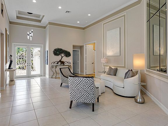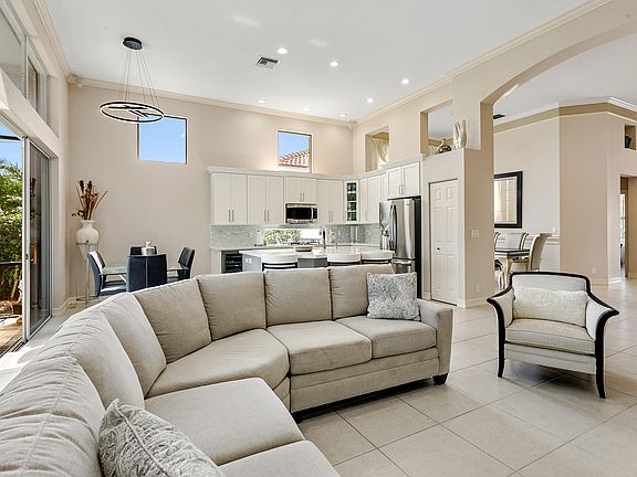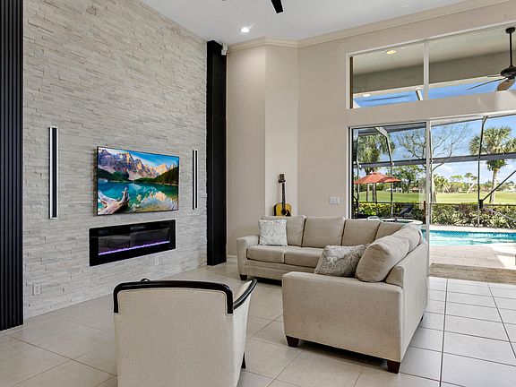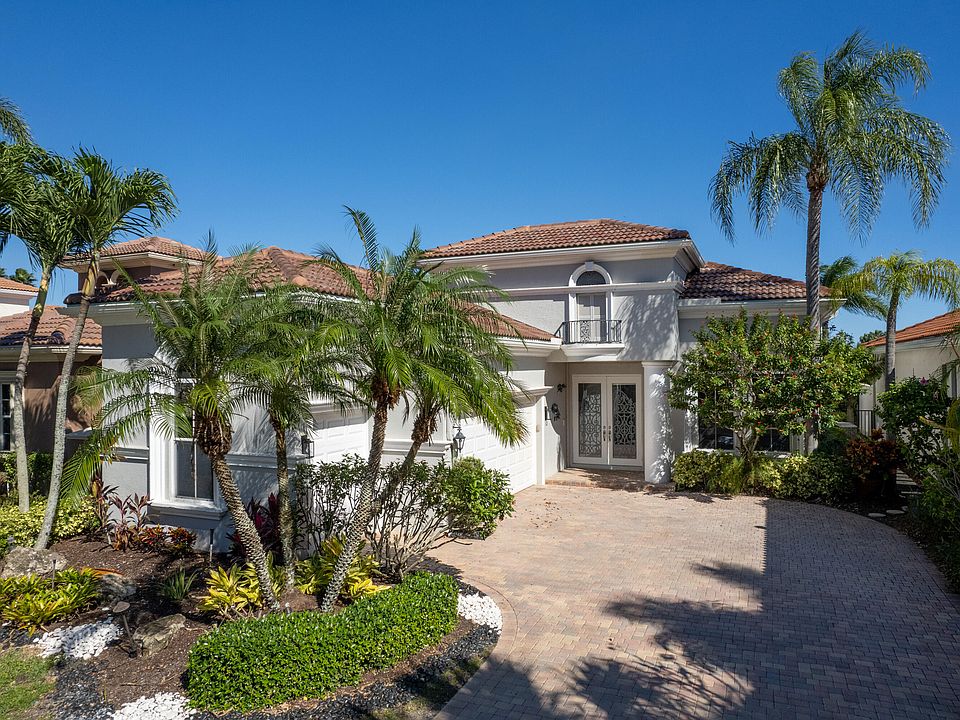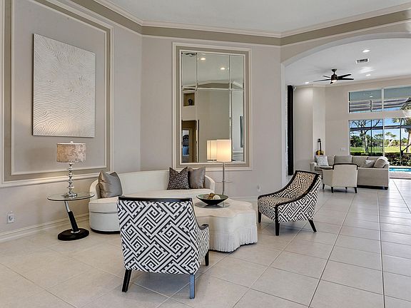 Enjoy the golf view from this stunning home situated on the first hole of the Jack Nicklaus-designed Tradition Golf Course. The 3BR/3BA home is in the highly sought after neighborhood of Via Villagio. This home boasts dramatic architecture, extensive crown molding, coffered ceilings, and an open feel from the moment you enter. The wonderfully renovated kitchen offers custom white wood cabinetry, Quartz countertops, upgraded designer hardware and backsplash, and upgraded stainless GE appliance package. New custom floor-to-ceiling built-in feature wall in the family room to add to the architecture with beautiful ledger stone and new LED fireplace. Enjoy the magnificent travertine pool deck and stunning pool and spa. There is generous space for outdoor dining, sunbathing, and relaxation. Accordion storm shutters protect the exterior of this home. The spacious primary suite with sitting area also features access to the outdoor screened area, floor to ceiling windows and 2 walk-in closets with build-ins for ample storage. The primary bath has been completely renovated with new marble flooring and new hydro shower complete with body jets, rain head and frameless floor-to-ceiling shower door, new vanities, Toto toilet in private water closet, and custom solid teak wood shelving. New LED recessed lighting throughout. All bedrooms are generously sized and ensuite with the 3rd bedroom having new vinyl plank flooring. A brand-new roof in 2024 provides peace of mind. The 2-car garage plus golf cart garage has additional storage. The term "CLOSE TO THE CLUBHOUSE" is an understatement here; a short walk or a quick ride on the cart path (accessed at the end of the cul-de-sac) and you're in the heart of the world class amenities Ibis Golf and Country Club has to offer including: three Jack Nicklaus-designed golf courses, four unique dining experiences, tennis complex, pickleball, fitness center, spa, resort style pool, lap pool and much more.