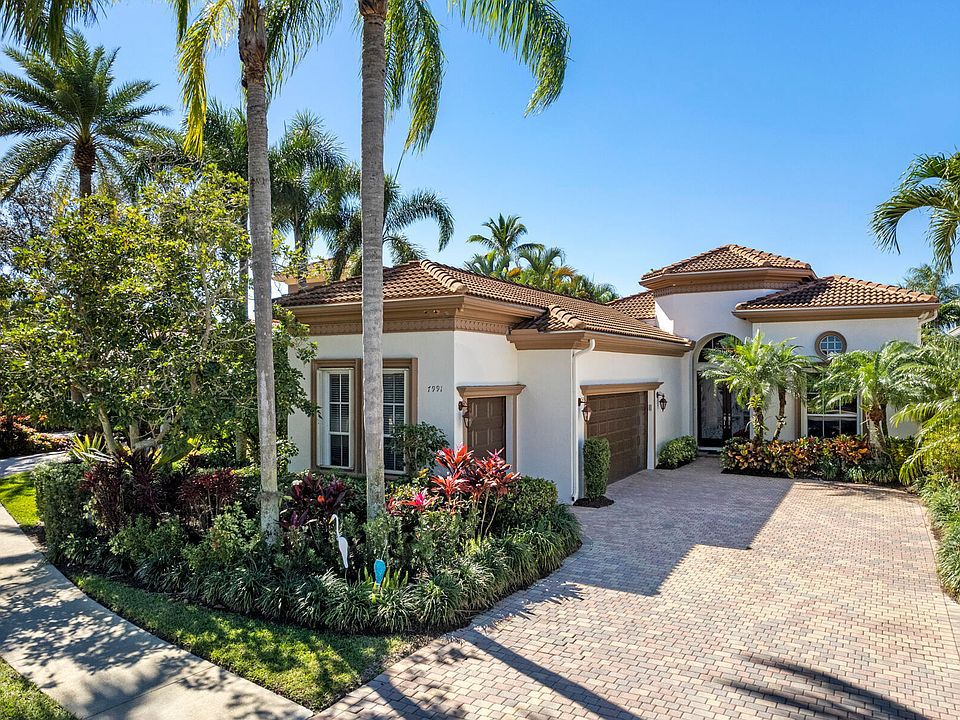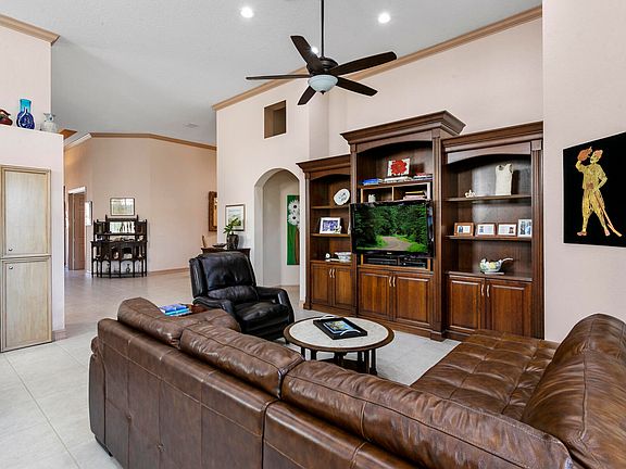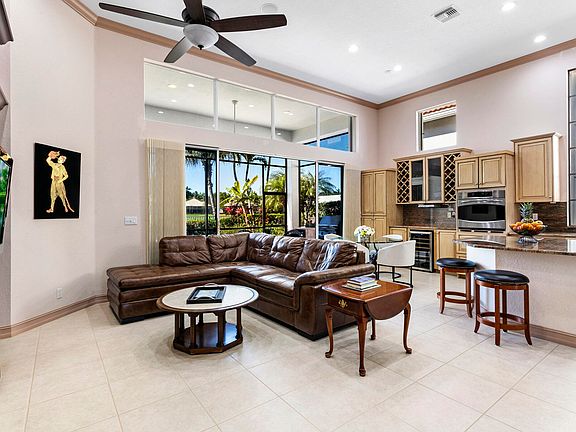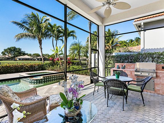 Enjoy picturesque sunsets and spectacular lake views while overlooking the 18th hole on the Jack Nicklaus-designed Tradition Golf Course. With 3BR/3BA PLUS den/office this delightful Capri model home is in the highly sought after neighborhood of Via Villagio. This home boasts dramatic architecture, extensive crown molding, soaring ceilings and an open feel from the moment you enter. The kitchen expansion provides additional cabinetry, wine storage, granite tops, stainless steel appliances including a double drawer dishwasher. Step outdoors into the spacious screened area featuring a summer kitchen, power shade and plenty of room for relaxation or dining al fresco. Enjoy the open-air pool and waterfall spa with utmost tranquility as there is NO CART PATH directly behind this property. The spacious primary suite with sitting area also features access to the outdoor screened area, floor to ceiling widows and 2 walk-in closets with build-ins for ample storage. NEW LED recessed lighting throughout. A NEWER ROOF and complete accordion hurricane protection provide peace of mind. The 2-car garage plus golf cart garage has custom cabinetry. The term "CLOSE TO THE CLUBHOUSE" is an understatement here; a short walk or a quick ride on the cart path (accessed at the end of the cul-de-sac) and you're in the heart of the world class amenities Ibis Golf and Country Club has to offer including: three Jack Nicklaus-designed golf courses, four unique dining experiences, tennis complex, pickleball, fitness center, spa, resort style pool, lap pool and much more.