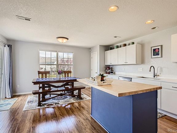 kitchen and the dining area. The kitchen boasts a butcher-block island, gorgeous quartz countertops, and a pantry for