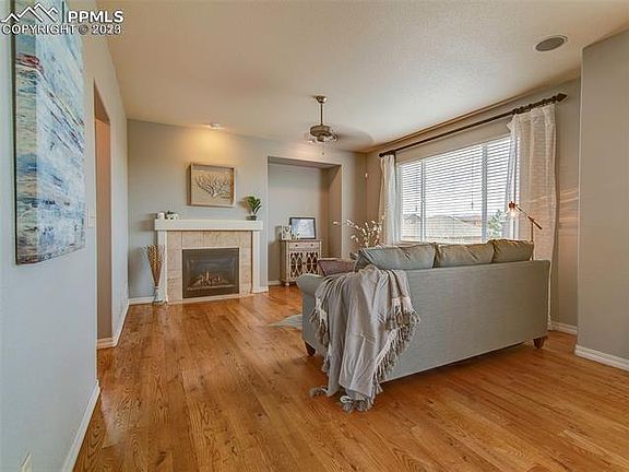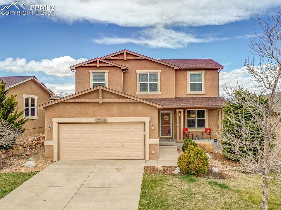 This beautiful former model home in Cumbre Vista is a must see. Extensive hardwoods grace the main level with tall ceilings & upgraded lighting. Expansive mountain views across the back side of the home, with spectacular Pikes Peak view from the primary bedroom! The main level also includes a formal dining room and open kitchen that looks into the family room. Huge main bedroom with 2-sided fireplace alongside 3 generous upper bedrooms. The kitchen was nicely upgraded when built with detailed cabinets, Corian counters, stainless appliances, 5-burner glass cooktop, and adjacent deck with views. Mature landscaping provides nice privacy. The 25' deep garage is 3-5 ft deeper than average, great for your trucks or toys! Home equipped with surround sound speakers in many rooms. Walk-out basement to patio, walk-out kitchen to deck, walk-out front door to community park. Front bedrooms all look toward the park and playground across the street. Master bedroom suite maximizes those views to the west! Unfinished basement is ready for your final touches with a bathroom rough-in.