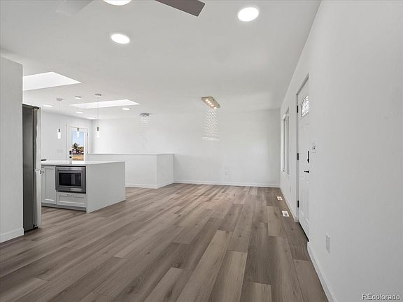 Step into a radiant oasis where Colorado's sunlight gracefully filters through two generous skylights, showcasing a meticulously designed kitchen. With shimmering quartz countertops set against a backdrop of stainless steel appliances, this space is prepped for culinary delights and cherished gatherings.
