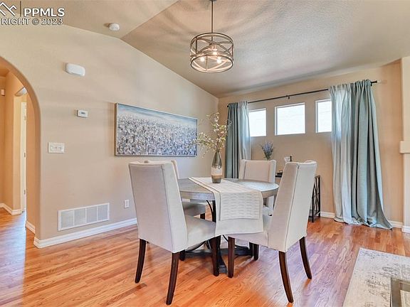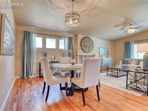 An open floor plan makes living easy in this Cumbre Vista home! This immaculate 4 bedroom, 3 bath home is adorned with wood floors and high ceilings throughout the great room. Whether you are enjoying the gas fireplace from the couch or dining area, this shared space is large enough for everyone to gather comfortably. In the private master suite, conveniently located on the main floor, you'll find a spacious bedroom with vaulted ceilings, a 5 piece bath and walk-in closet. With an additional bedroom on the main floor and 2 bedrooms in the basement, there is no shortage of space. The finished basement offers a family room large enough for both a sitting area where you can enjoy a movie and a space for recreation. With plentiful storage throughout the home and an oversized 2.5 car garage with high ceilings, this home has it all! Close to the Powers corridor, Cottonwood Creek Trail and District 20 schools nearby. You don't want to miss this opportunity!