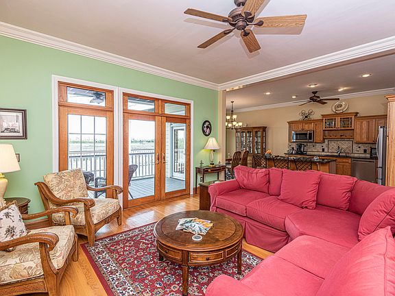 Virtual tour is attached! Want deep waterfront? This home is on the inter-coastal waterway and about a block from the cut-thru to access the ocean. Three (3) lots make up this 7.41 acres (could be subdivided) of beautiful trees, including many oaks and hard wood and a large stocked fish pond near the house. Major renovations completed recently including elevator for easier living. In 2019 all rooms updated and hard wood floors re-surfaced, all bathrooms redone from studs up, including closets added or enlarged, bidet combo in master, decorator paint colors that lend themselves to the peaceful setting. Open kitchen has induction range in island and there are hard wood floors through-out. Enjoy the incredible view and sea breezes from one of the many porches as you watch the boats go. Tandum parking under the house for 2 vehicles. Remainder of under house space can be used as a workshop or storage.