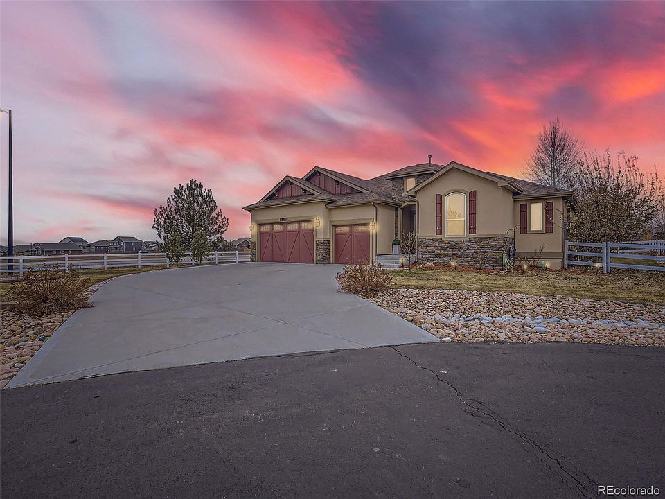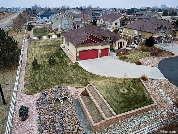 Discover the allure of Angel View Estates, an exclusive enclave within Frederick, Colorado. This sought-after neighborhood boasts just 62 distinctive custom & semi custom homes. At the culmination of a serene cul-de-sac lies a sprawling 3720 sq ft. ranch home. Boasting 5 bedrooms, including 2 master suites and 3 bathrooms, this residence welcomes you with an expansive open floor plan and an abundance of natural light filtering through numerous windows and gracing the elegant hardwood floors.The main-floor master suite is a sanctuary offering breathtaking vistas of the majestic Rocky Mountains, accompanied by a luxurious five-piece master bathroom and a spacious walk-in closet. With high ceilings enhancing the sense of space, the kitchen showcases granite countertops, stainless steel appliances including a Bosch ultra quiet dishwasher, a central island adorned with cabinets, a stylish kitchen faucet, and ample bar-style seating. Seamlessly connected, the floor plan leads to an inviting dining room and living area warmed by a charming fireplace. Completing the main floor are two additional bedrooms, each boasting ample closet space and sharing a well-appointed bathroom. The convenience of main-floor laundry situated adjacent to the master suite enhances practicality and ease of living. Descend into the finished basement, where an additional living space awaits, complete with a sleek wet bar featuring granite countertops. A generously sized master bedroom with a walk-in closet, ceiling fan, and a lavish full master bath beckons, accompanied by an extra bedroom down the hall which impresses with its spaciousness and a large walk-in closet. A large unfinished room has storage shelves to keep your life organized. Outside, a 3-car garage offers ample space and convenient yard access, while the landscaped and fenced 1/3 acre yard provides a picturesque backdrop of the Front Range mountains. Reach out to the agent directly to schedule your showing. 720-434-7375